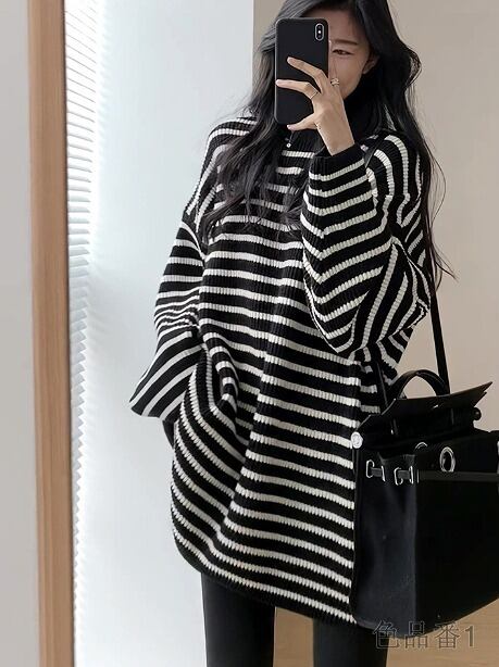 ニット 厚手 長袖 バイカラー 体型カバー 着痩せ カットソー ボーダー柄 シンプル カジュアル カットソー 羽織り トップス 配色 ストライプ柄 ライン