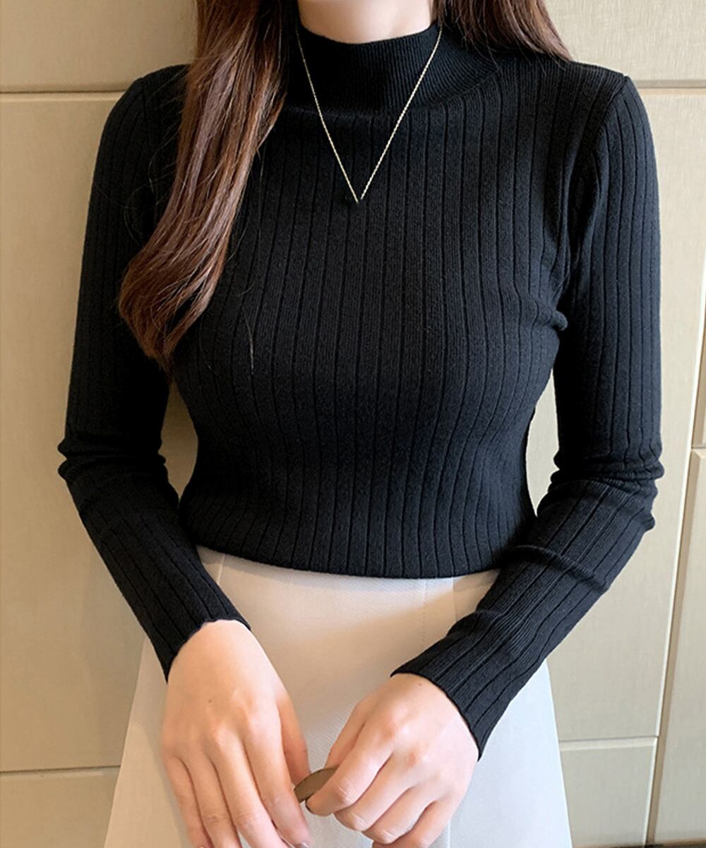 【日本倉庫即納】 韓国リブニットトップス ハイネック 長袖