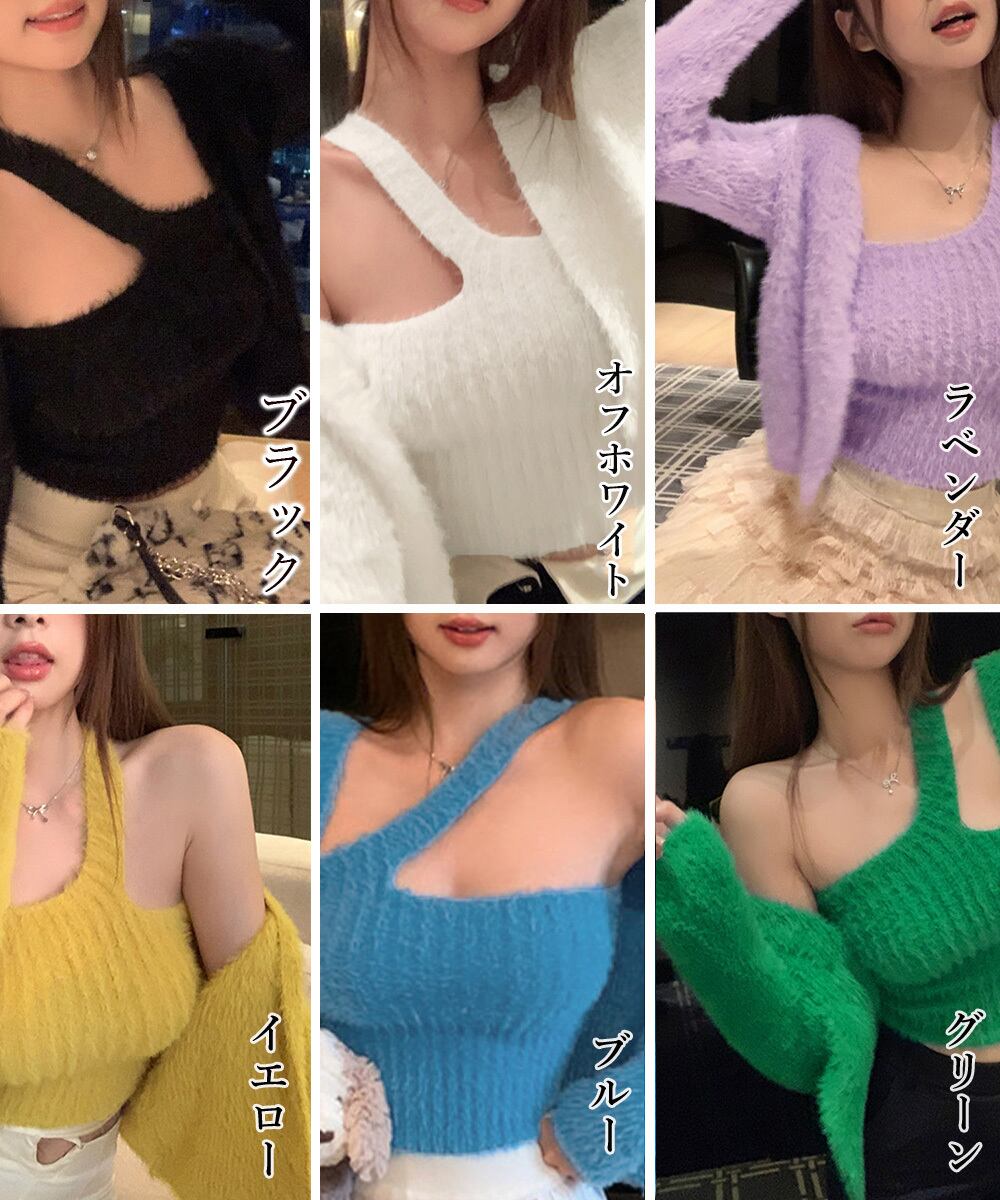 ワンショルダーデザインのニットビスチェにショート丈長袖カーディガンのミンクファー風ニットトップス2点セット