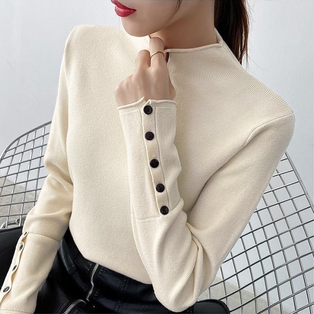 ニットセーター レディース トップス 無地 プルオーバー 飾りボタン ボトルネック インナー カットソー